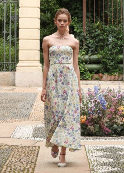Chemisier a righe, applicazioni floreali tridimensionali, colori pastello e una cascata di ruche sfilano alla Milano Fashion Week sulla passerella Primavera/Estate 2026 di Luisa Beccaria