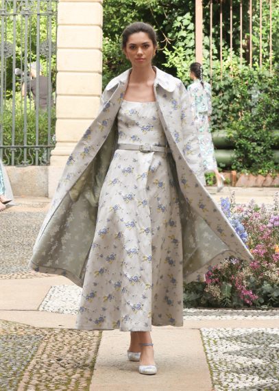 Chemisier a righe, applicazioni floreali tridimensionali, colori pastello e una cascata di ruche sfilano alla Milano Fashion Week sulla passerella Primavera/Estate 2026 di Luisa Beccaria