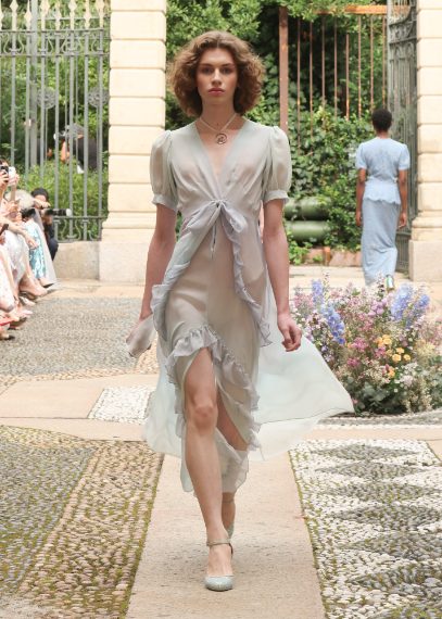 Chemisier a righe, applicazioni floreali tridimensionali, colori pastello e una cascata di ruche sfilano alla Milano Fashion Week sulla passerella Primavera/Estate 2026 di Luisa Beccaria