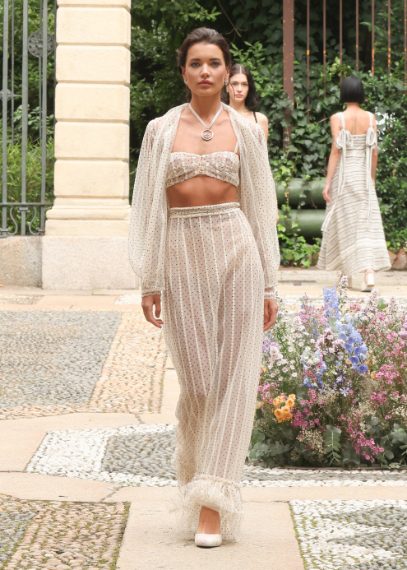 Chemisier a righe, applicazioni floreali tridimensionali, colori pastello e una cascata di ruche sfilano alla Milano Fashion Week sulla passerella Primavera/Estate 2026 di Luisa Beccaria
