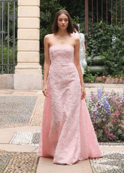 Chemisier a righe, applicazioni floreali tridimensionali, colori pastello e una cascata di ruche sfilano alla Milano Fashion Week sulla passerella Primavera/Estate 2026 di Luisa Beccaria