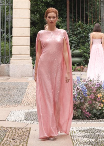 Chemisier a righe, applicazioni floreali tridimensionali, colori pastello e una cascata di ruche sfilano alla Milano Fashion Week sulla passerella Primavera/Estate 2026 di Luisa Beccaria