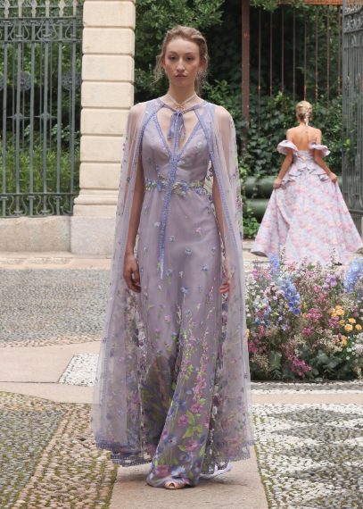 Chemisier a righe, applicazioni floreali tridimensionali, colori pastello e una cascata di ruche sfilano alla Milano Fashion Week sulla passerella Primavera/Estate 2026 di Luisa Beccaria