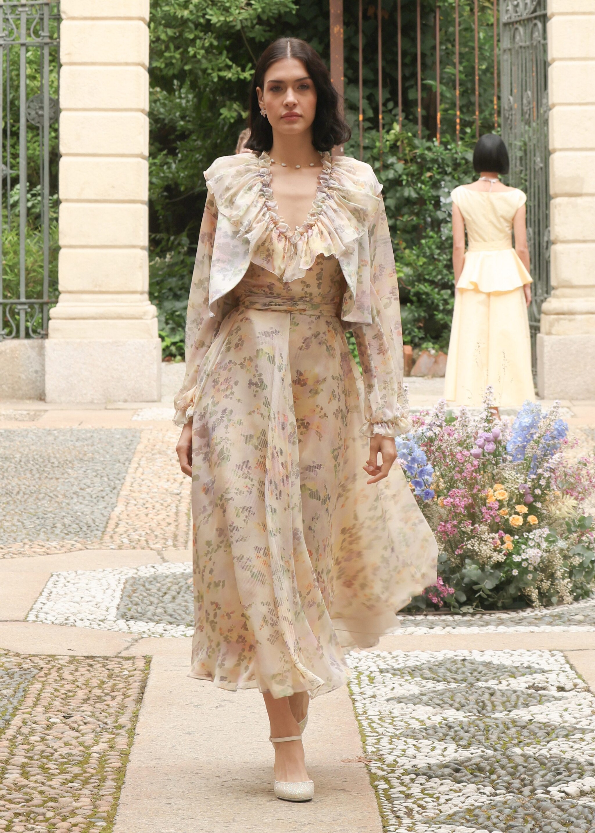 Chemisier a righe, applicazioni floreali tridimensionali, colori pastello e una cascata di ruche sfilano alla Milano Fashion Week sulla passerella Primavera/Estate 2026 di Luisa Beccaria