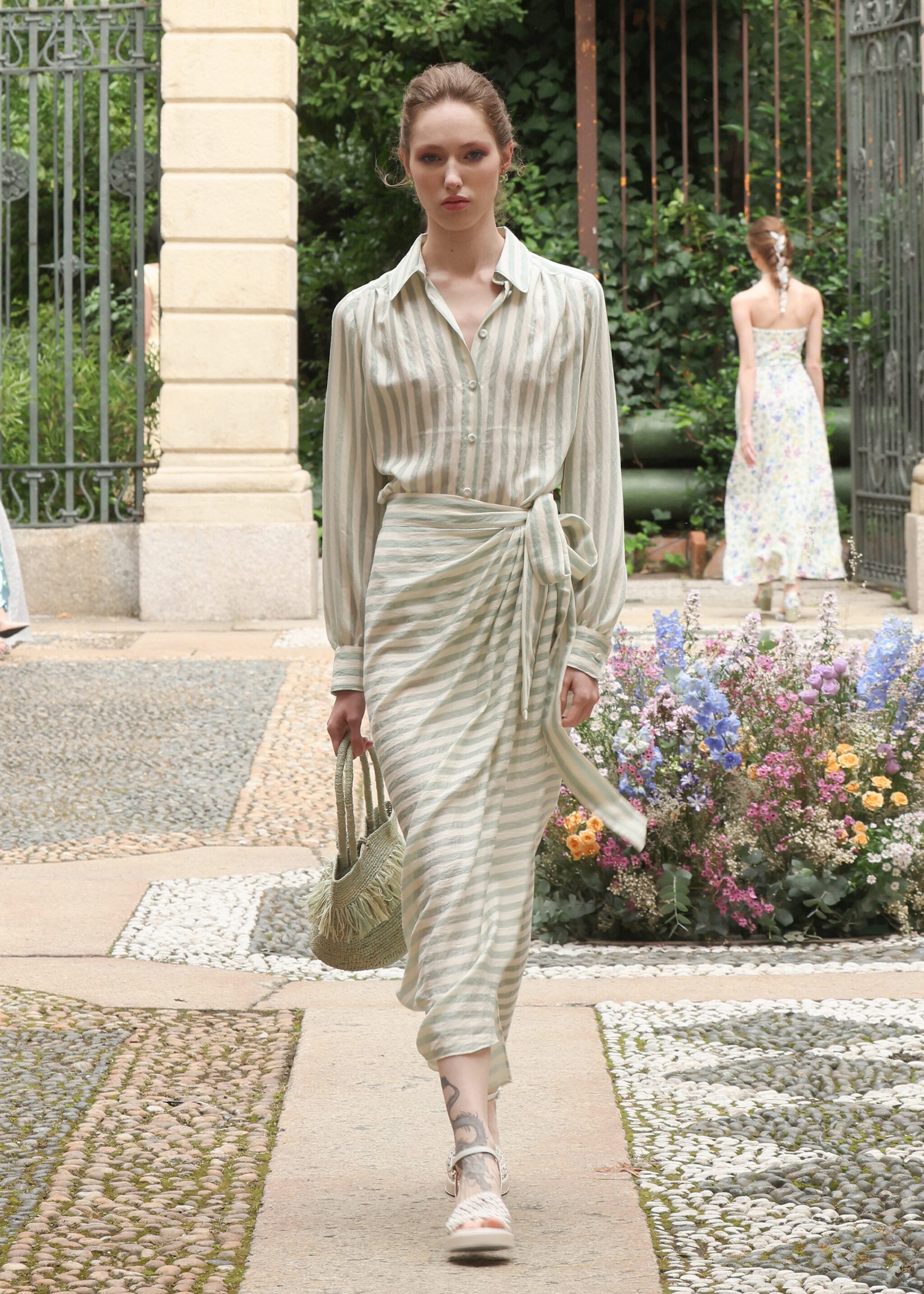 Chemisier a righe, applicazioni floreali tridimensionali, colori pastello e una cascata di ruche sfilano alla Milano Fashion Week sulla passerella Primavera/Estate 2026 di Luisa Beccaria