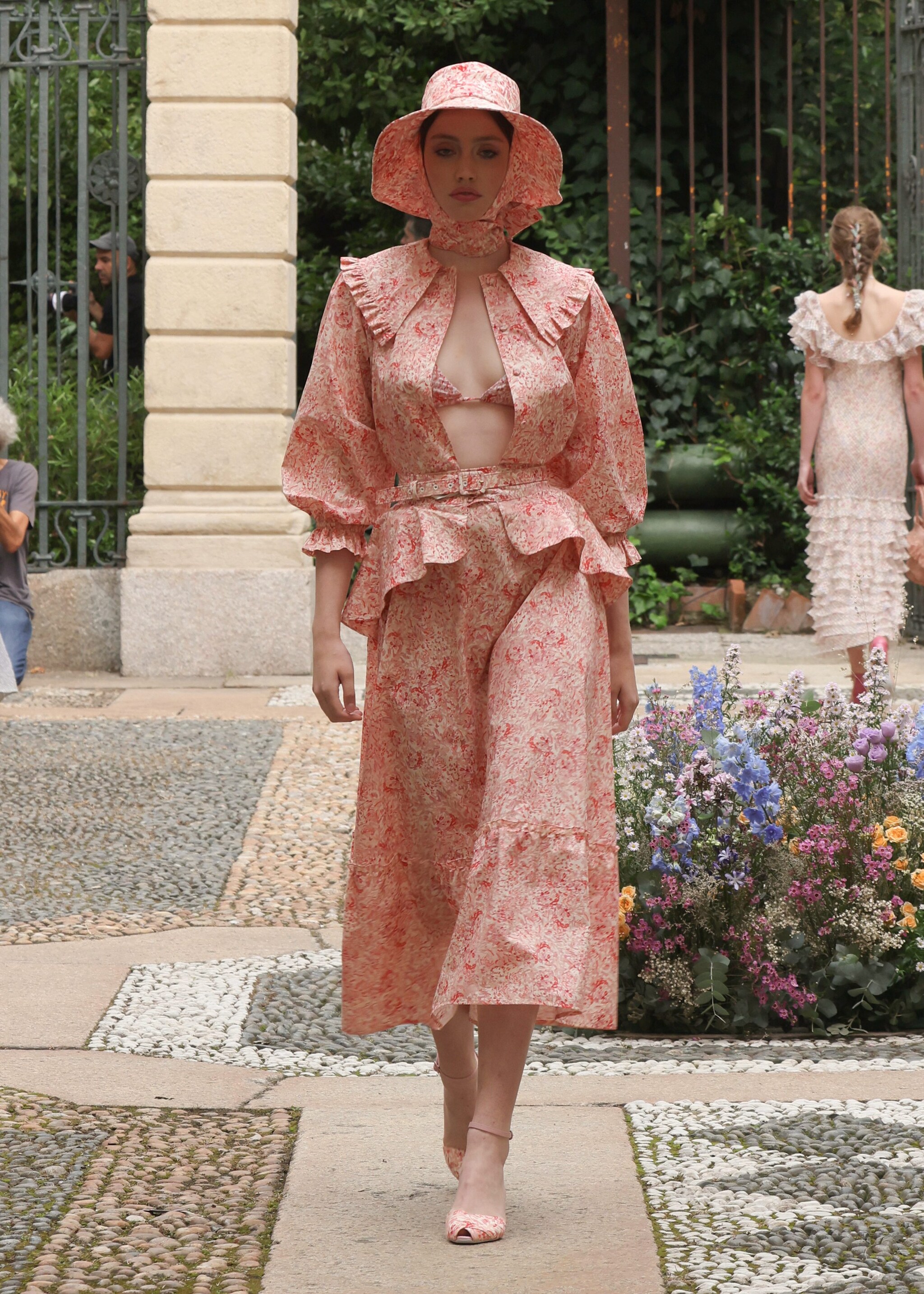 Chemisier a righe, applicazioni floreali tridimensionali, colori pastello e una cascata di ruche sfilano alla Milano Fashion Week sulla passerella Primavera/Estate 2026 di Luisa Beccaria