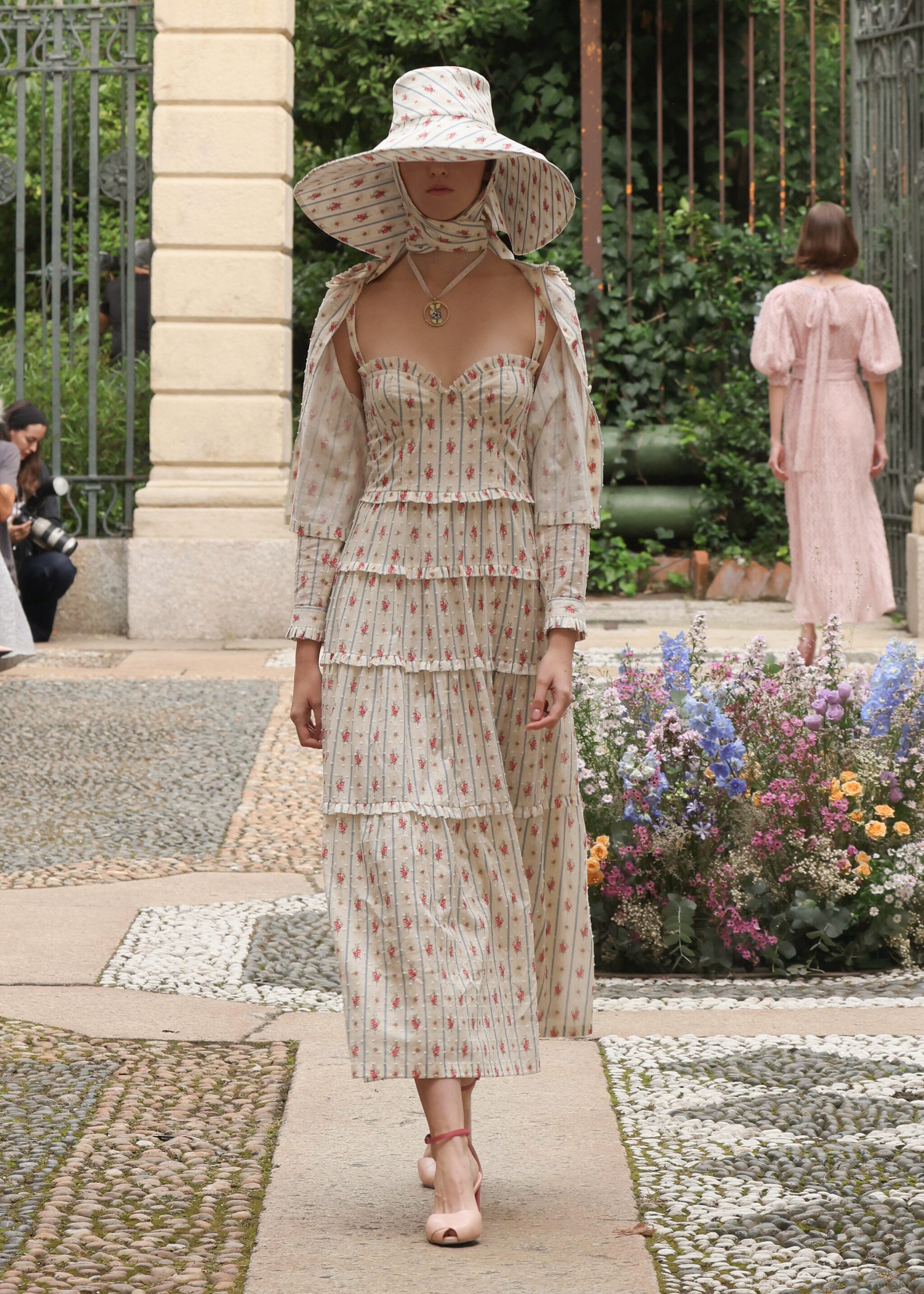 Chemisier a righe, applicazioni floreali tridimensionali, colori pastello e una cascata di ruche sfilano alla Milano Fashion Week sulla passerella Primavera/Estate 2026 di Luisa Beccaria