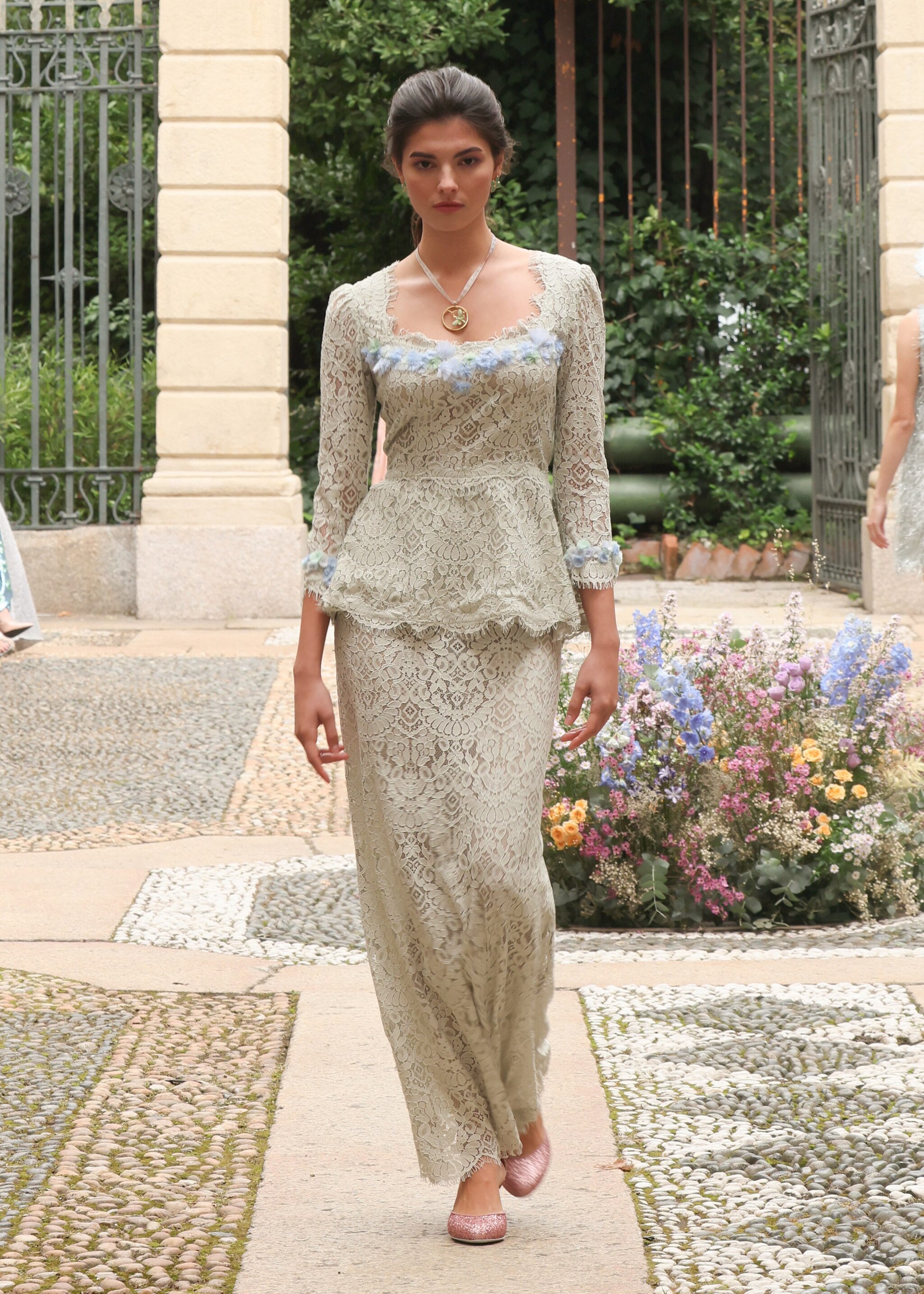 Chemisier a righe, applicazioni floreali tridimensionali, colori pastello e una cascata di ruche sfilano alla Milano Fashion Week sulla passerella Primavera/Estate 2026 di Luisa Beccaria