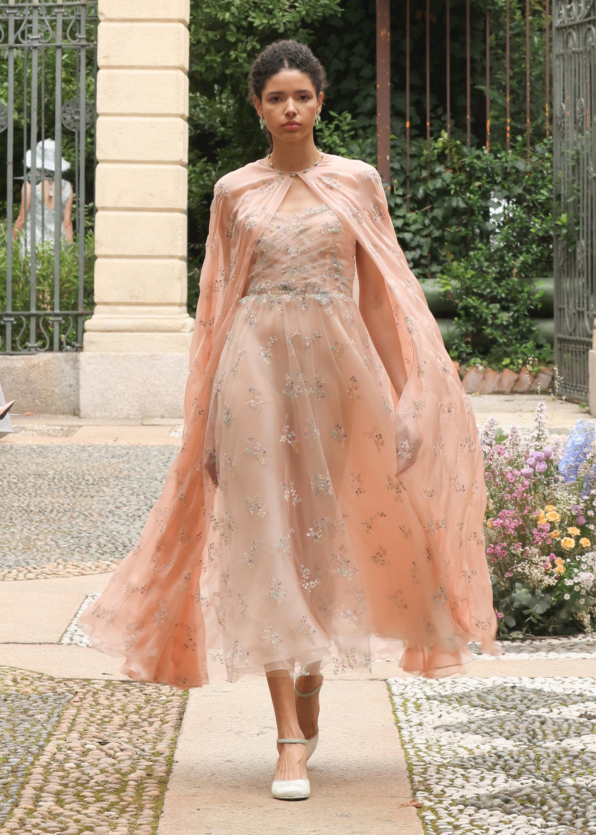 Chemisier a righe, applicazioni floreali tridimensionali, colori pastello e una cascata di ruche sfilano alla Milano Fashion Week sulla passerella Primavera/Estate 2026 di Luisa Beccaria