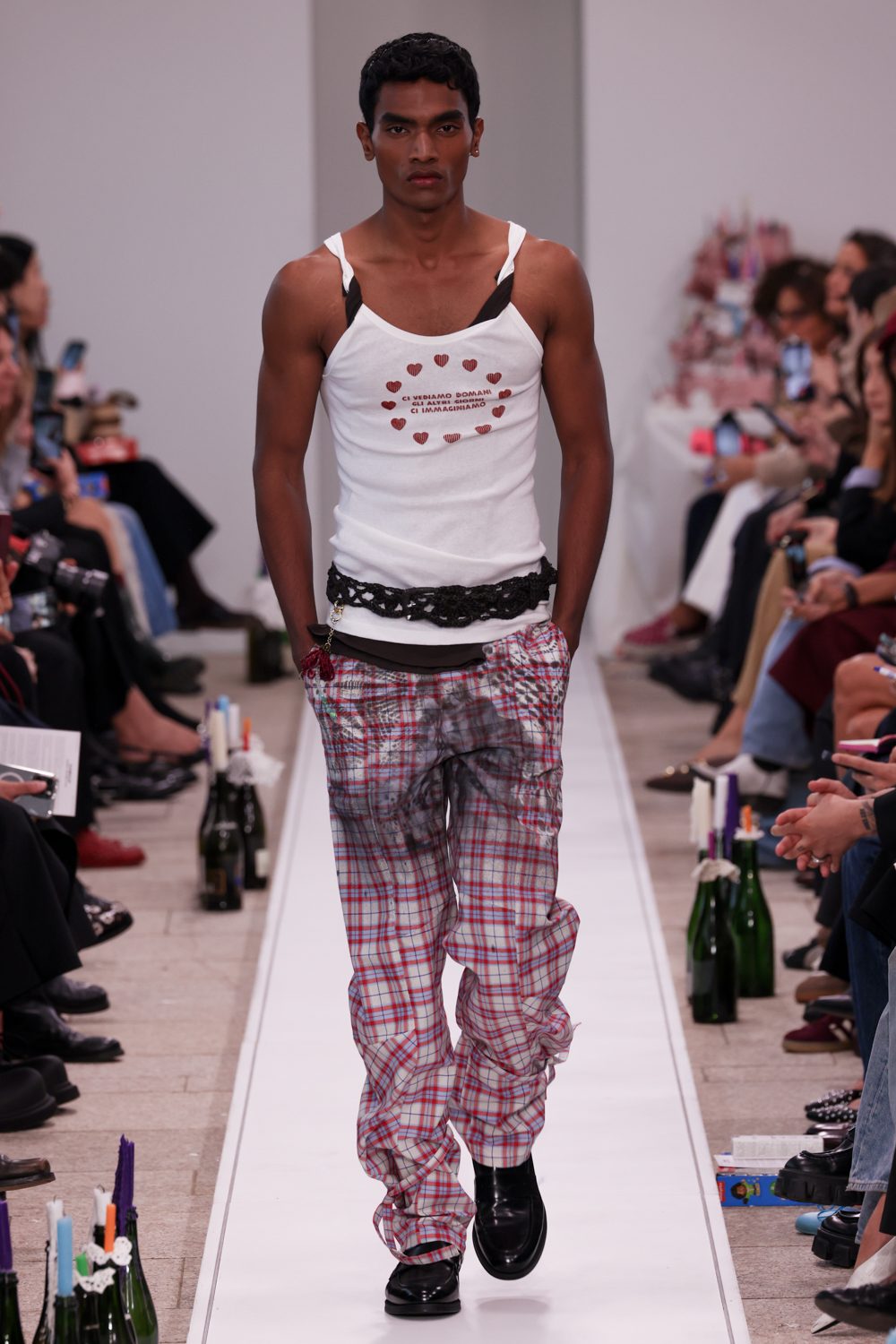 Look a effetto layering, inserti crochet, rimandi al mondo della lingerie e dell'intimo e ancora canotte e slip stampati sfilano alla Milano Fashion Week sulla passerella Primavera/Estate 2026 di Marco Rambaldi.