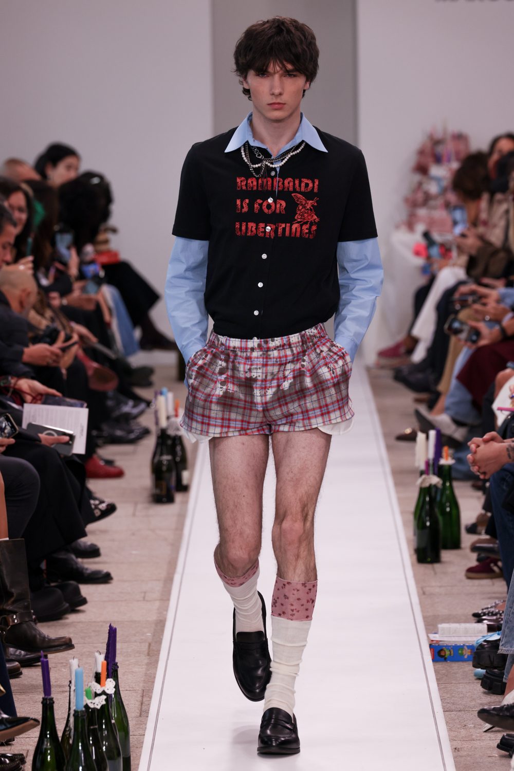 Look a effetto layering, inserti crochet, rimandi al mondo della lingerie e dell'intimo e ancora canotte e slip stampati sfilano alla Milano Fashion Week sulla passerella Primavera/Estate 2026 di Marco Rambaldi.