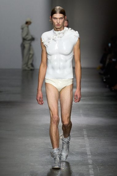 Cascate di perle, applicazioni in pizzo su denim o su abiti che nascono da collant strappati, ali d'acciaio, piume bianche o rosse e corpetti in porcellana che sembrano vasi piedi di fiori sfilano alla Milano Fashion Week sulla passerella Primavera/Estate 2026 di Giuseppe Di Morabito