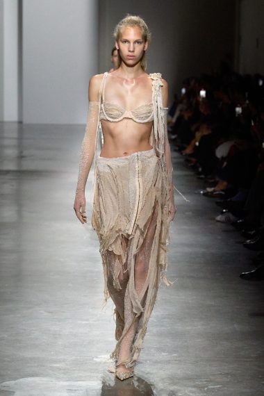 Cascate di perle, applicazioni in pizzo su denim o su abiti che nascono da collant strappati, ali d'acciaio, piume bianche o rosse e corpetti in porcellana che sembrano vasi piedi di fiori sfilano alla Milano Fashion Week sulla passerella Primavera/Estate 2026 di Giuseppe Di Morabito