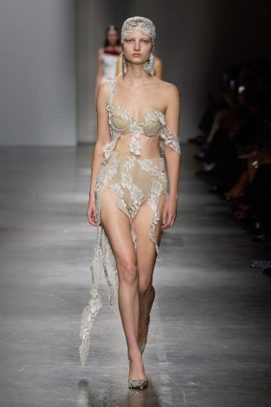 Cascate di perle, applicazioni in pizzo su denim o su abiti che nascono da collant strappati, ali d'acciaio, piume bianche o rosse e corpetti in porcellana che sembrano vasi piedi di fiori sfilano alla Milano Fashion Week sulla passerella Primavera/Estate 2026 di Giuseppe Di Morabito