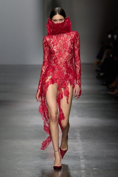 Cascate di perle, applicazioni in pizzo su denim o su abiti che nascono da collant strappati, ali d'acciaio, piume bianche o rosse e corpetti in porcellana che sembrano vasi piedi di fiori sfilano alla Milano Fashion Week sulla passerella Primavera/Estate 2026 di Giuseppe Di Morabito