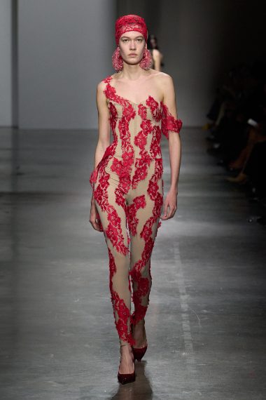 Cascate di perle, applicazioni in pizzo su denim o su abiti che nascono da collant strappati, ali d'acciaio, piume bianche o rosse e corpetti in porcellana che sembrano vasi piedi di fiori sfilano alla Milano Fashion Week sulla passerella Primavera/Estate 2026 di Giuseppe Di Morabito