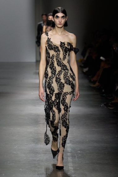 Cascate di perle, applicazioni in pizzo su denim o su abiti che nascono da collant strappati, ali d'acciaio, piume bianche o rosse e corpetti in porcellana che sembrano vasi piedi di fiori sfilano alla Milano Fashion Week sulla passerella Primavera/Estate 2026 di Giuseppe Di Morabito