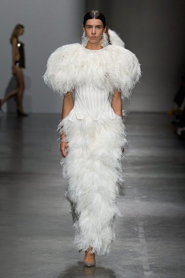 Cascate di perle, applicazioni in pizzo su denim o su abiti che nascono da collant strappati, ali d'acciaio, piume bianche o rosse e corpetti in porcellana che sembrano vasi piedi di fiori sfilano alla Milano Fashion Week sulla passerella Primavera/Estate 2026 di Giuseppe Di Morabito