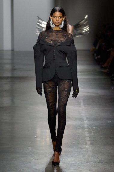 Cascate di perle, applicazioni in pizzo su denim o su abiti che nascono da collant strappati, ali d'acciaio, piume bianche o rosse e corpetti in porcellana che sembrano vasi piedi di fiori sfilano alla Milano Fashion Week sulla passerella Primavera/Estate 2026 di Giuseppe Di Morabito