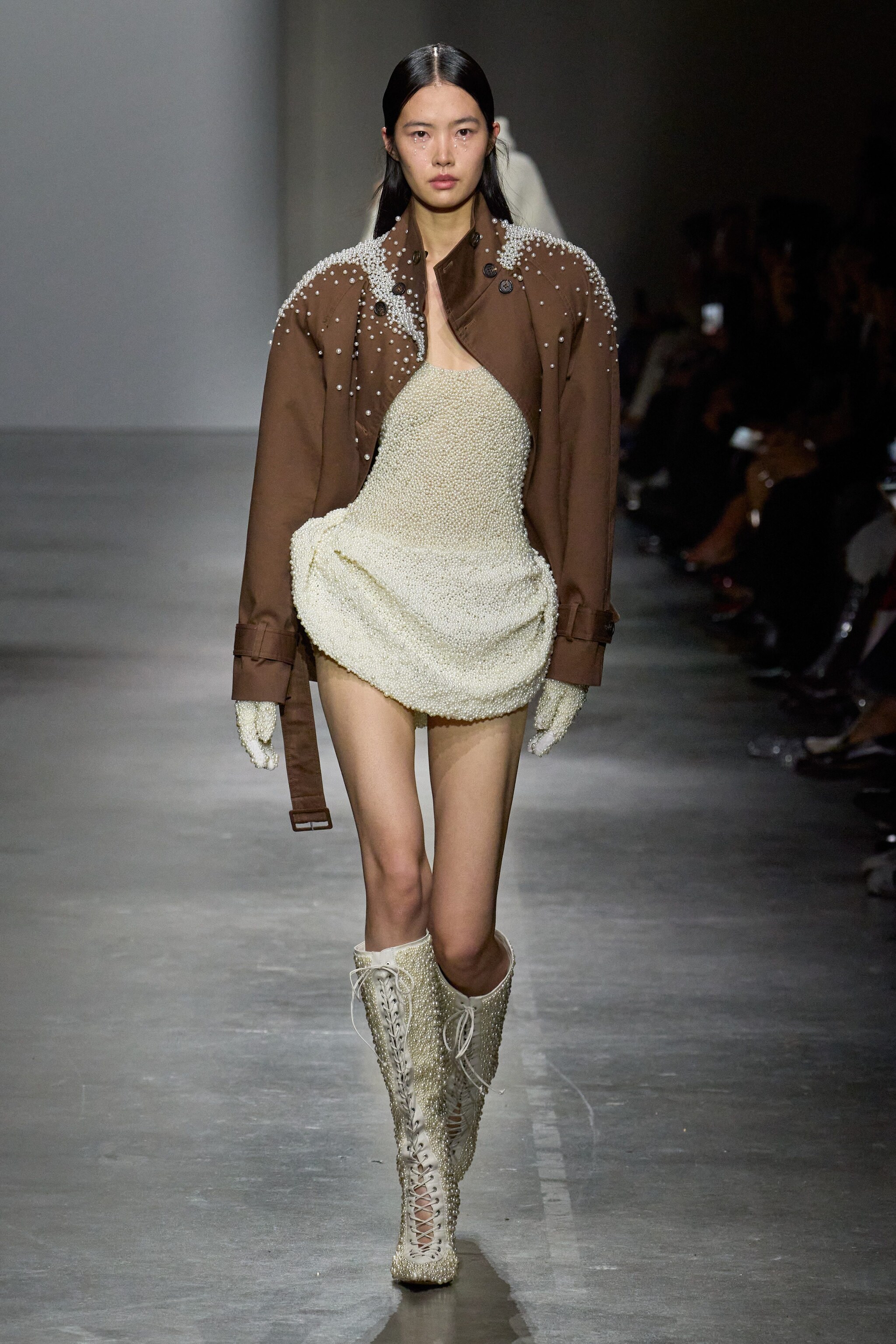 Cascate di perle, applicazioni in pizzo su denim o su abiti che nascono da collant strappati, ali d'acciaio, piume bianche o rosse e corpetti in porcellana che sembrano vasi piedi di fiori sfilano alla Milano Fashion Week sulla passerella Primavera/Estate 2026 di Giuseppe Di Morabito