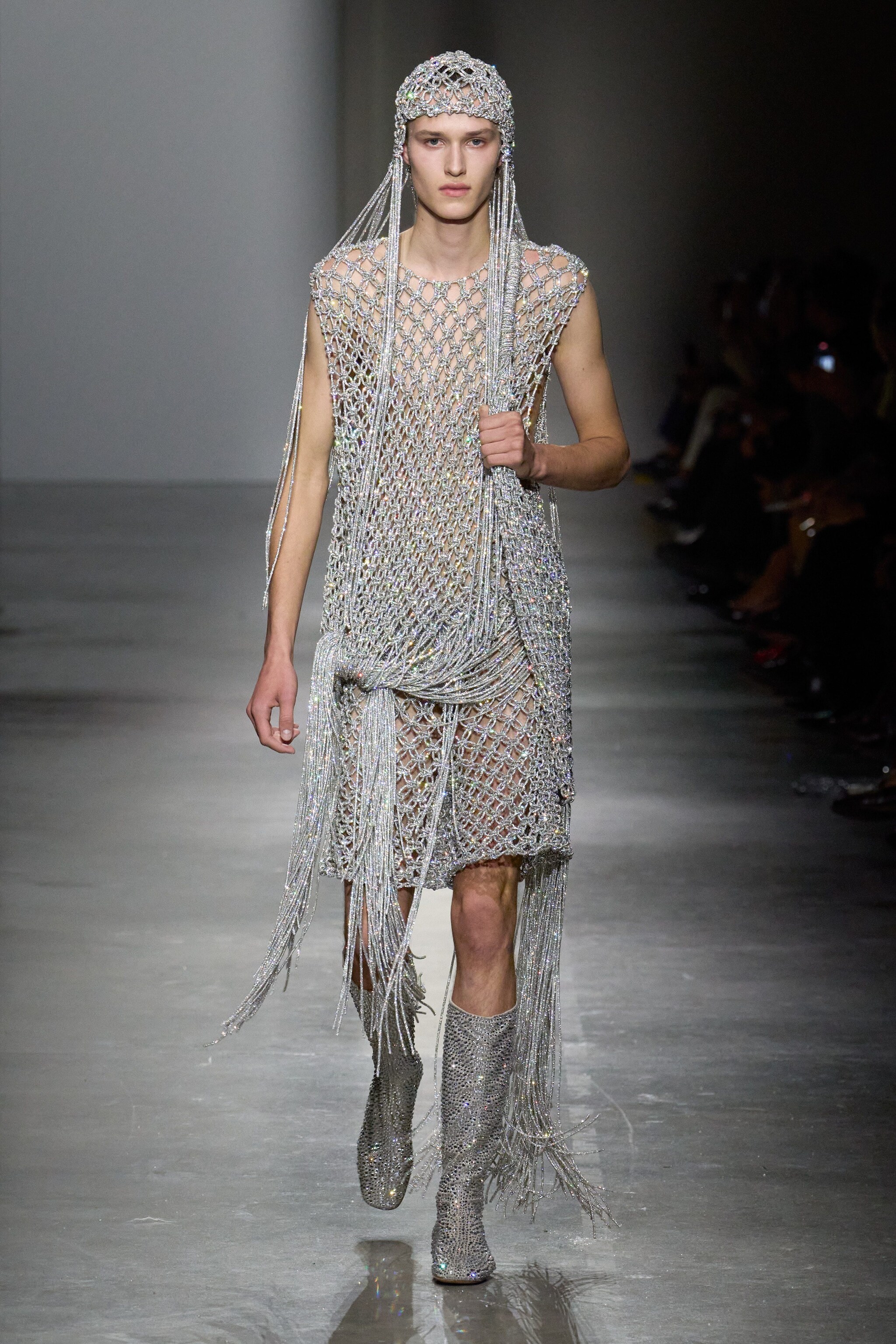 Cascate di perle, applicazioni in pizzo su denim o su abiti che nascono da collant strappati, ali d'acciaio, piume bianche o rosse e corpetti in porcellana che sembrano vasi piedi di fiori sfilano alla Milano Fashion Week sulla passerella Primavera/Estate 2026 di Giuseppe Di Morabito