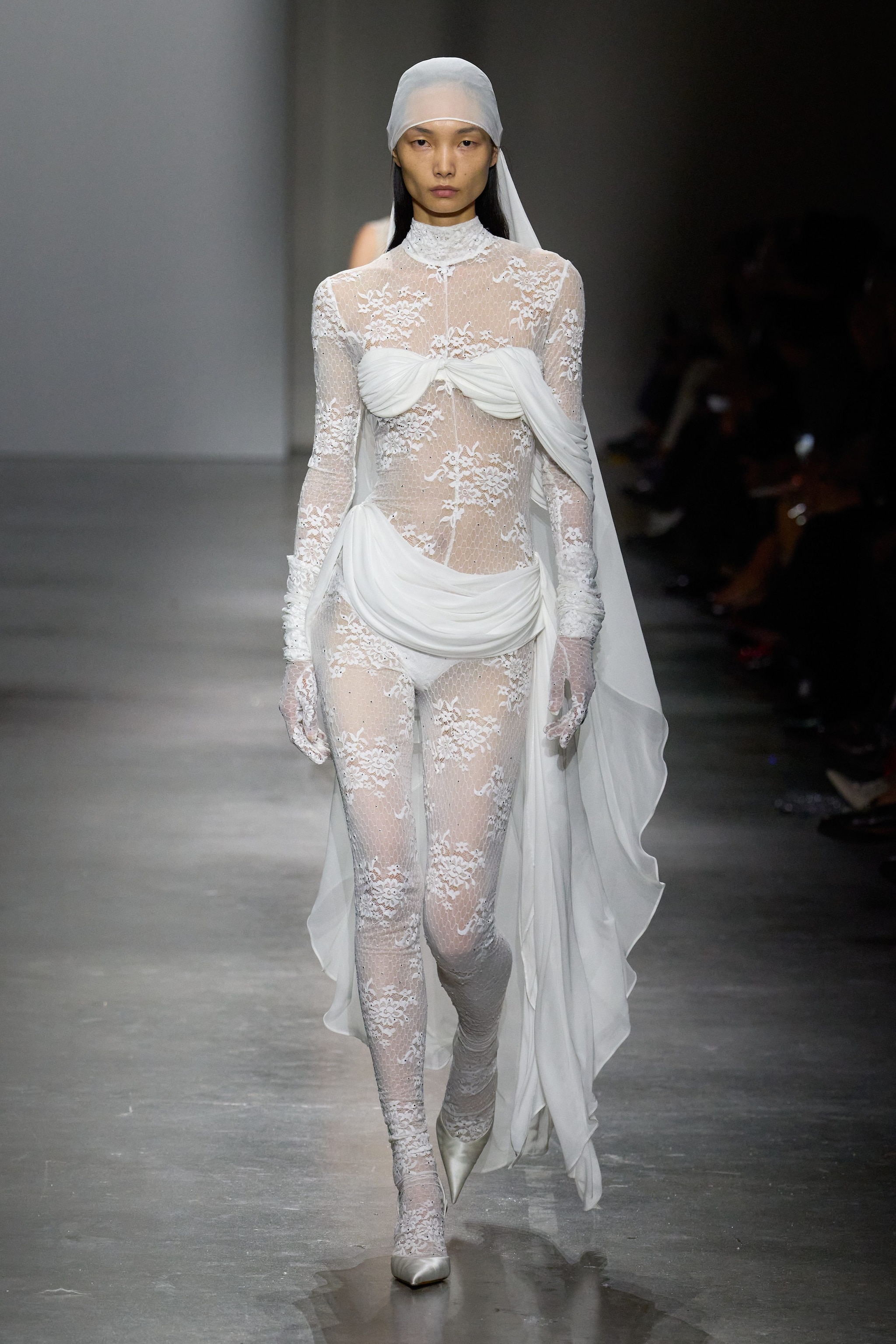 Cascate di perle, applicazioni in pizzo su denim o su abiti che nascono da collant strappati, ali d'acciaio, piume bianche o rosse e corpetti in porcellana che sembrano vasi piedi di fiori sfilano alla Milano Fashion Week sulla passerella Primavera/Estate 2026 di Giuseppe Di Morabito