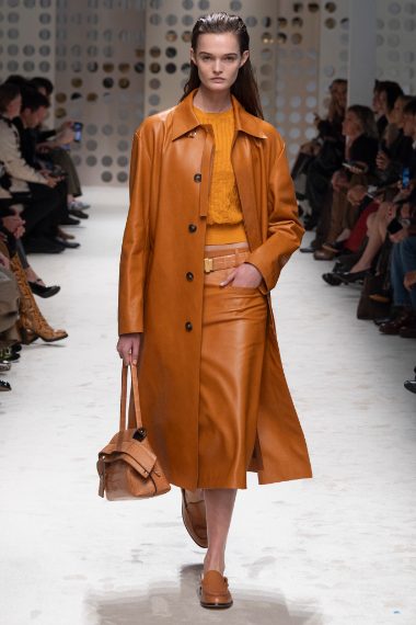 Completi in pelle color caramello e tubini in black leather con drappeggi e ancora stampe tartan o a rgihe sfilano alla Milano Fashion Week sulla passerella Primavera/Estate 2026 di Tod's.