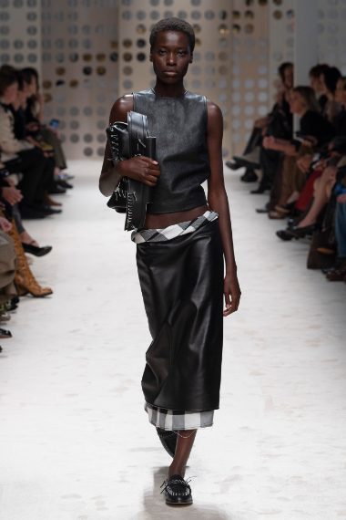 Completi in pelle color caramello e tubini in black leather con drappeggi e ancora stampe tartan o a rgihe sfilano alla Milano Fashion Week sulla passerella Primavera/Estate 2026 di Tod's.