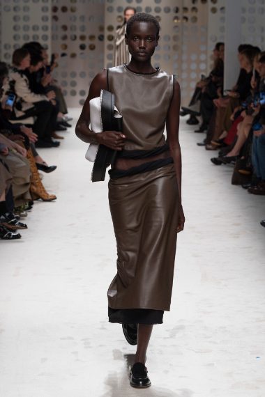 Completi in pelle color caramello e tubini in black leather con drappeggi e ancora stampe tartan o a rgihe sfilano alla Milano Fashion Week sulla passerella Primavera/Estate 2026 di Tod's.