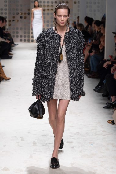 Completi in pelle color caramello e tubini in black leather con drappeggi e ancora stampe tartan o a rgihe sfilano alla Milano Fashion Week sulla passerella Primavera/Estate 2026 di Tod's.