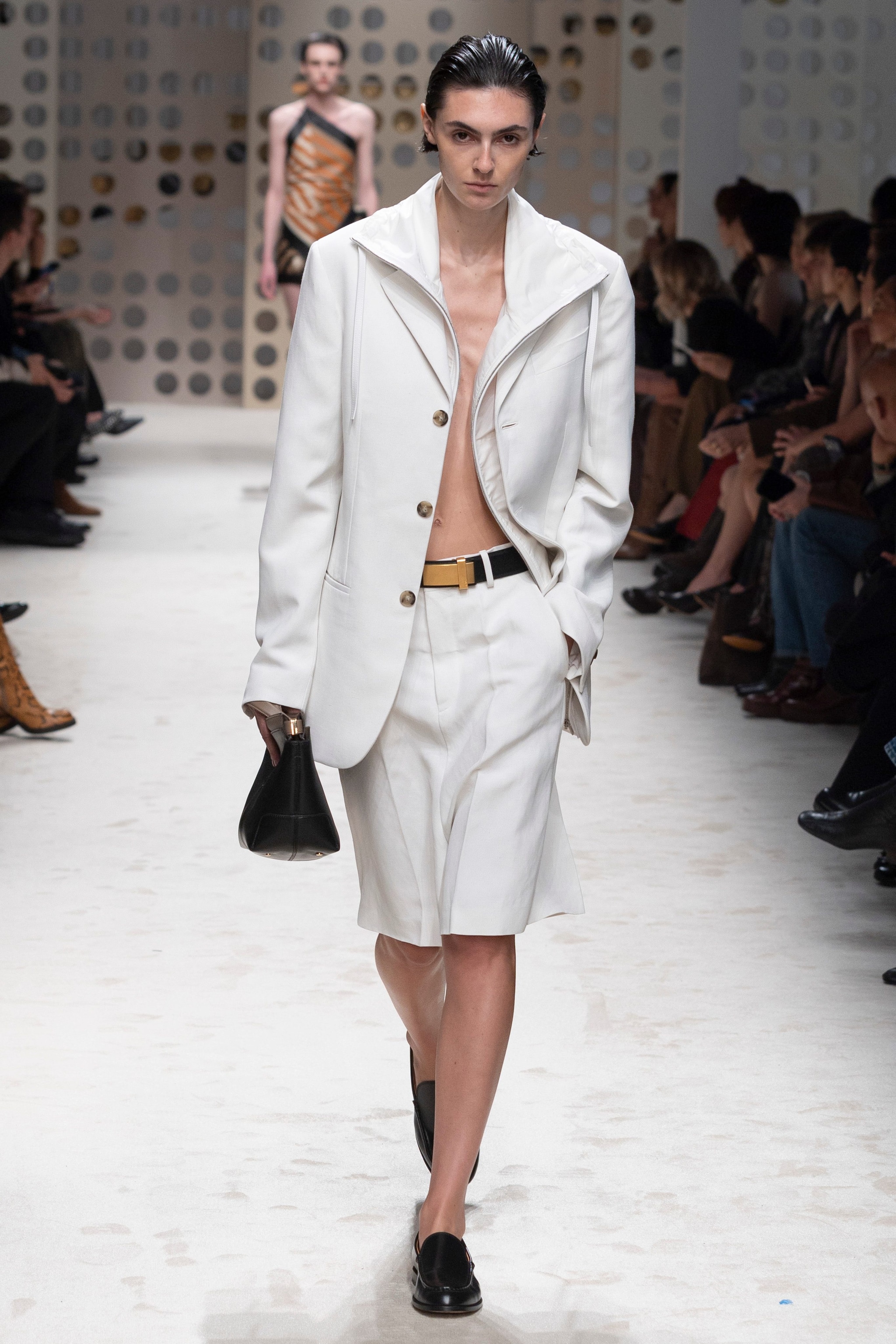 Completi in pelle color caramello e tubini in black leather con drappeggi e ancora stampe tartan o a rgihe sfilano alla Milano Fashion Week sulla passerella Primavera/Estate 2026 di Tod's.