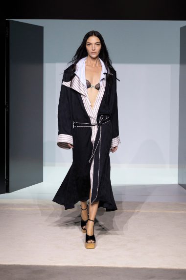 Blazer e trench dalle spalle oversize, vestaglie e pigiami che diventano abiti e completi da sera e ancora tutine aderenti in pizzo, slipdress e gonne a vita bassa sfilano alla Milano Fashion Week sulla passerella Primavera/Estate 2026 di The Attico