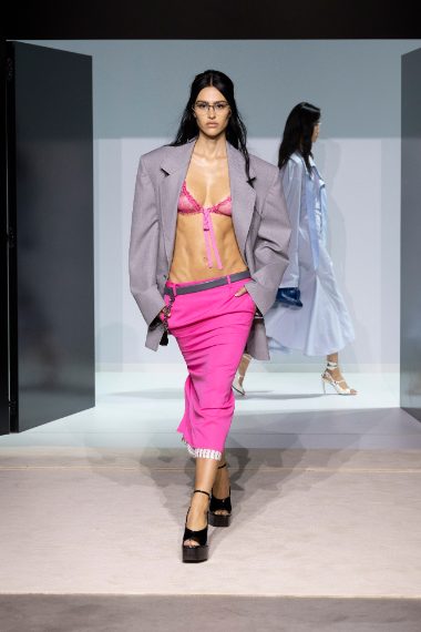 Blazer e trench dalle spalle oversize, vestaglie e pigiami che diventano abiti e completi da sera e ancora tutine aderenti in pizzo, slipdress e gonne a vita bassa sfilano alla Milano Fashion Week sulla passerella Primavera/Estate 2026 di The Attico