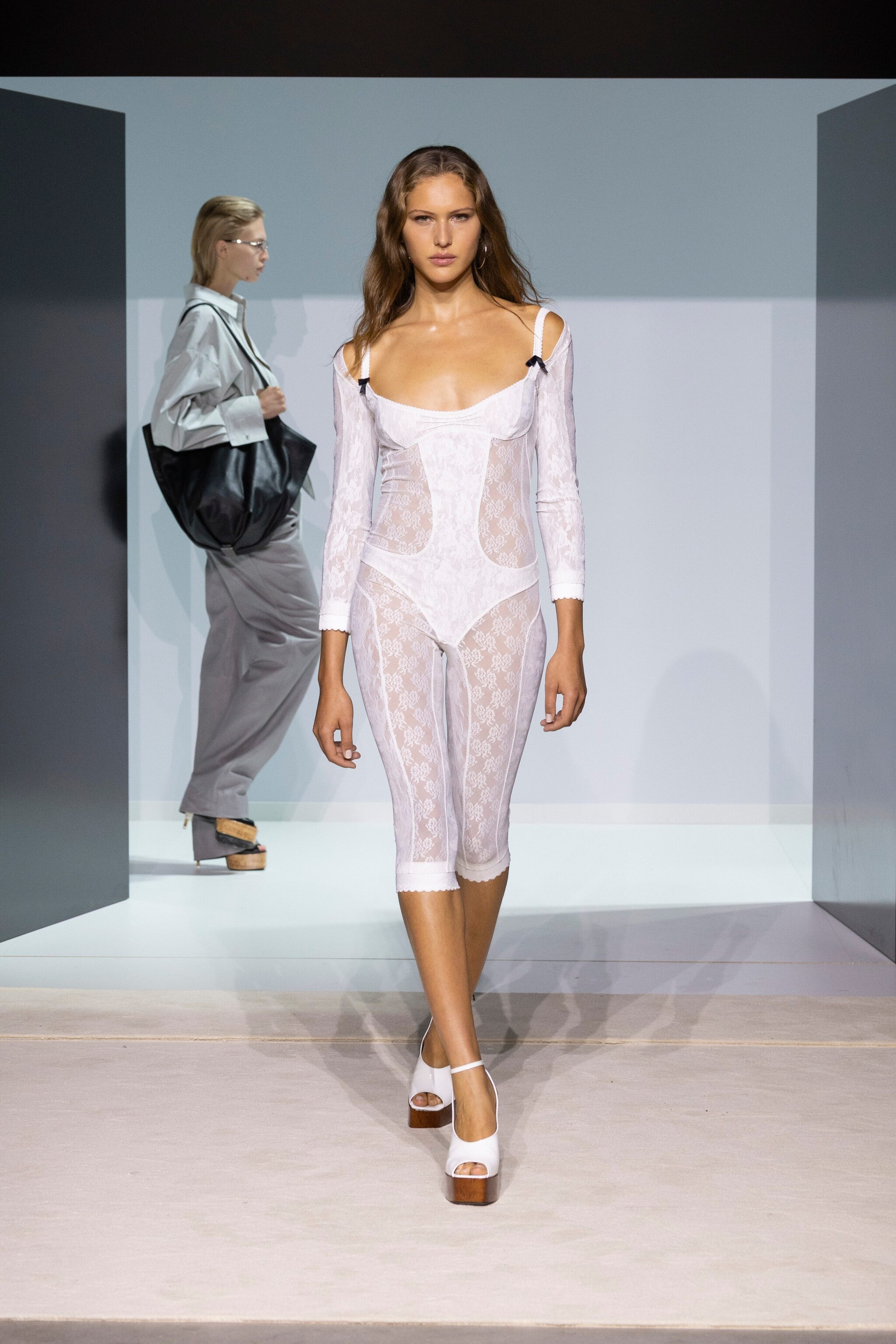 Blazer e trench dalle spalle oversize, vestaglie e pigiami che diventano abiti e completi da sera e ancora tutine aderenti in pizzo, slipdress e gonne a vita bassa sfilano alla Milano Fashion Week sulla passerella Primavera/Estate 2026 di The Attico