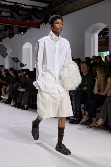 Sfila alla Milano Fashion Week la prima collezione disegnata da Louise Trotter per Bottega Veneta. Sulla passerella Primavera/Estate 2026 appaiono abiti in pelle drappeggiata e completi con l'iconico intreccio della Maison, sfilano leggiadre piume e frange che creano inaspettati volumi su giacche e bluse.