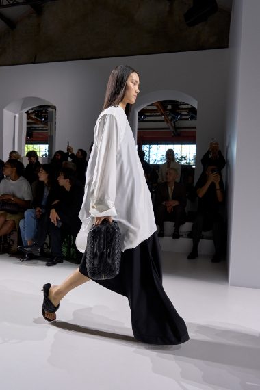 Sfila alla Milano Fashion Week la prima collezione disegnata da Louise Trotter per Bottega Veneta. Sulla passerella Primavera/Estate 2026 appaiono abiti in pelle drappeggiata e completi con l'iconico intreccio della Maison, sfilano leggiadre piume e frange che creano inaspettati volumi su giacche e bluse.