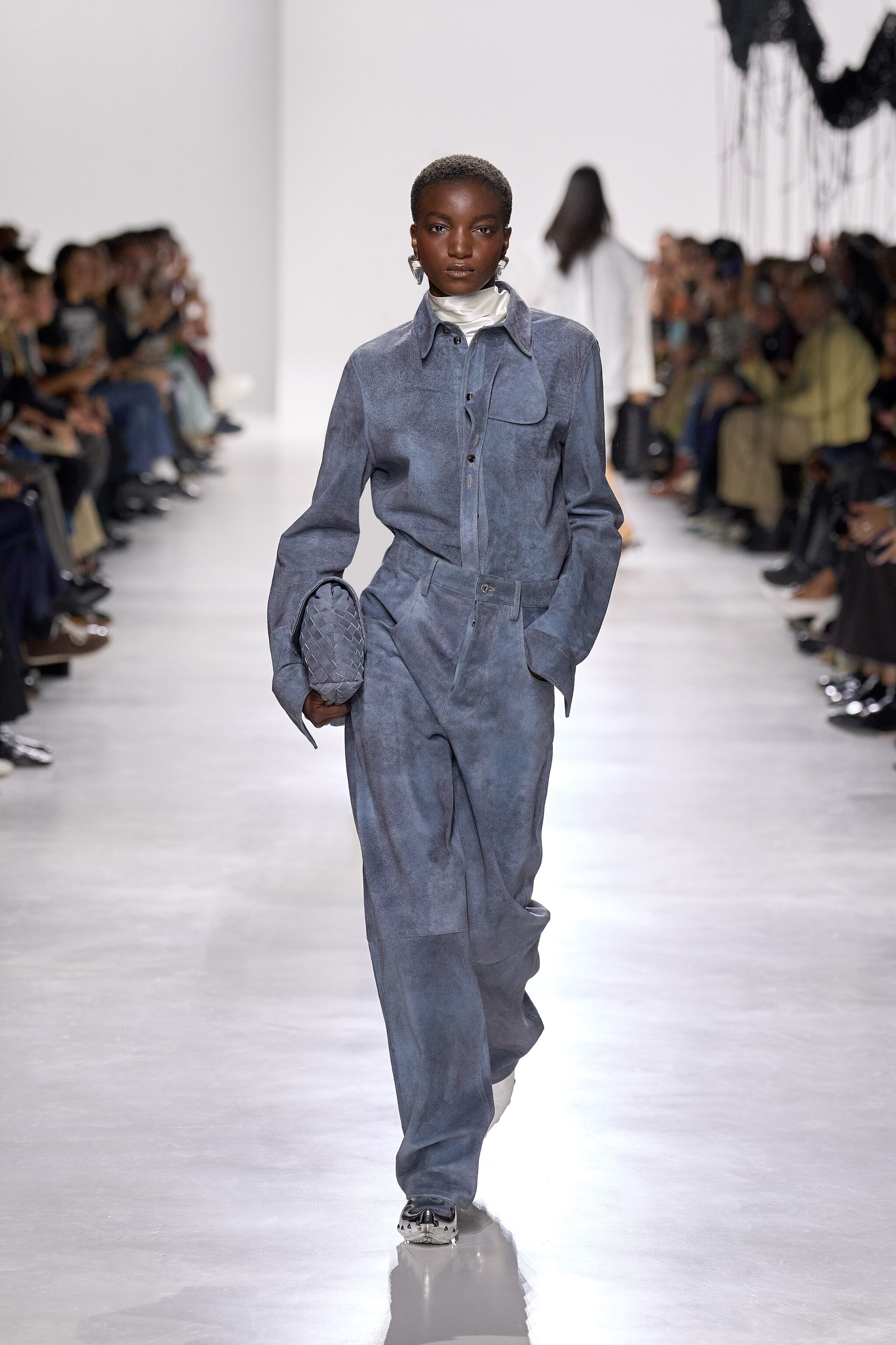 Sfila alla Milano Fashion Week la prima collezione disegnata da Louise Trotter per Bottega Veneta. Sulla passerella Primavera/Estate 2026 appaiono abiti in pelle drappeggiata e completi con l'iconico intreccio della Maison, sfilano leggiadre piume e frange che creano inaspettati volumi su giacche e bluse.