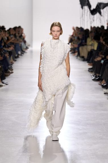 Sfila alla Milano Fashion Week la prima collezione disegnata da Louise Trotter per Bottega Veneta. Sulla passerella Primavera/Estate 2026 appaiono abiti in pelle drappeggiata e completi con l'iconico intreccio della Maison, sfilano leggiadre piume e frange che creano inaspettati volumi su giacche e bluse.