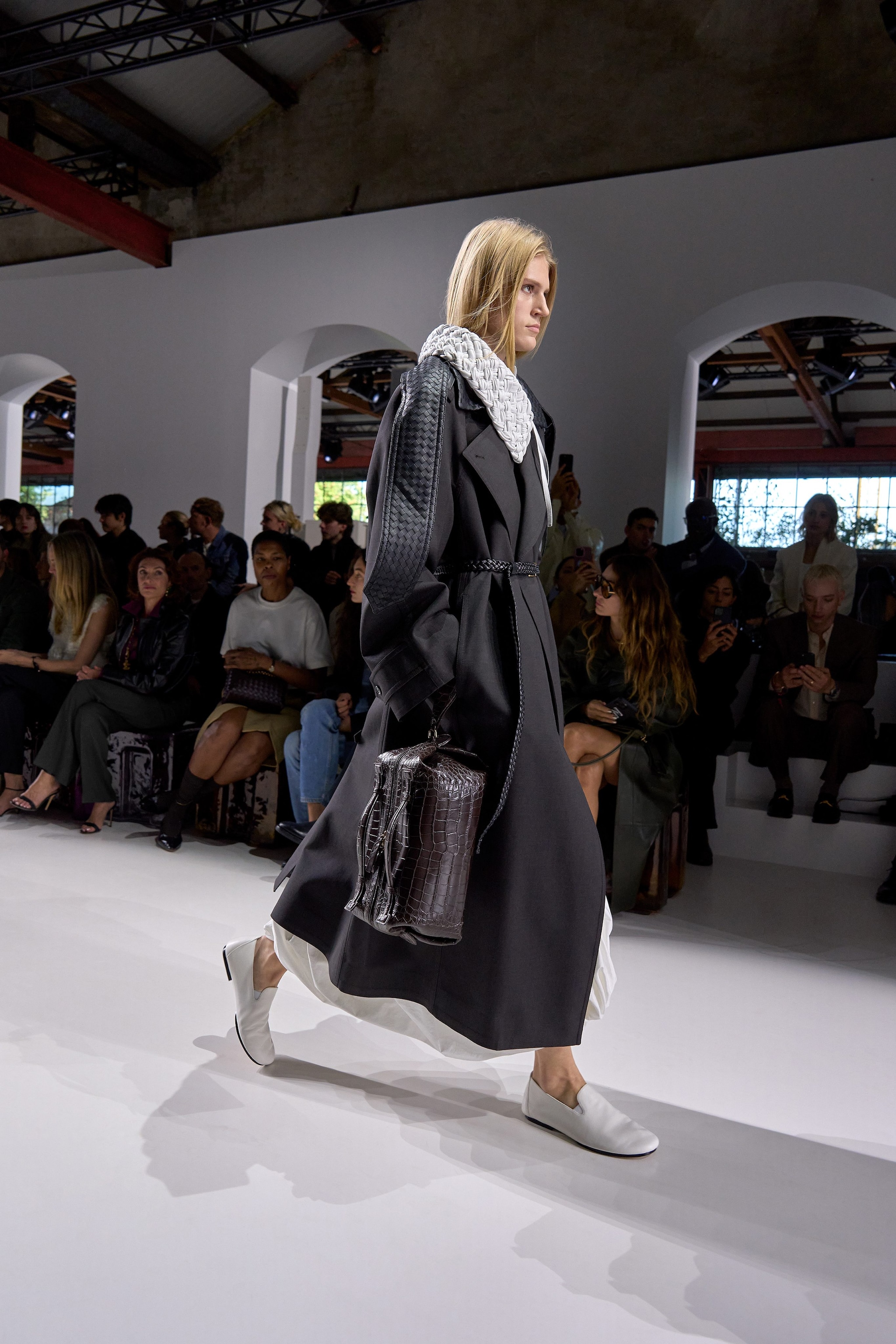 Sfila alla Milano Fashion Week la prima collezione disegnata da Louise Trotter per Bottega Veneta. Sulla passerella Primavera/Estate 2026 appaiono abiti in pelle drappeggiata e completi con l'iconico intreccio della Maison, sfilano leggiadre piume e frange che creano inaspettati volumi su giacche e bluse.