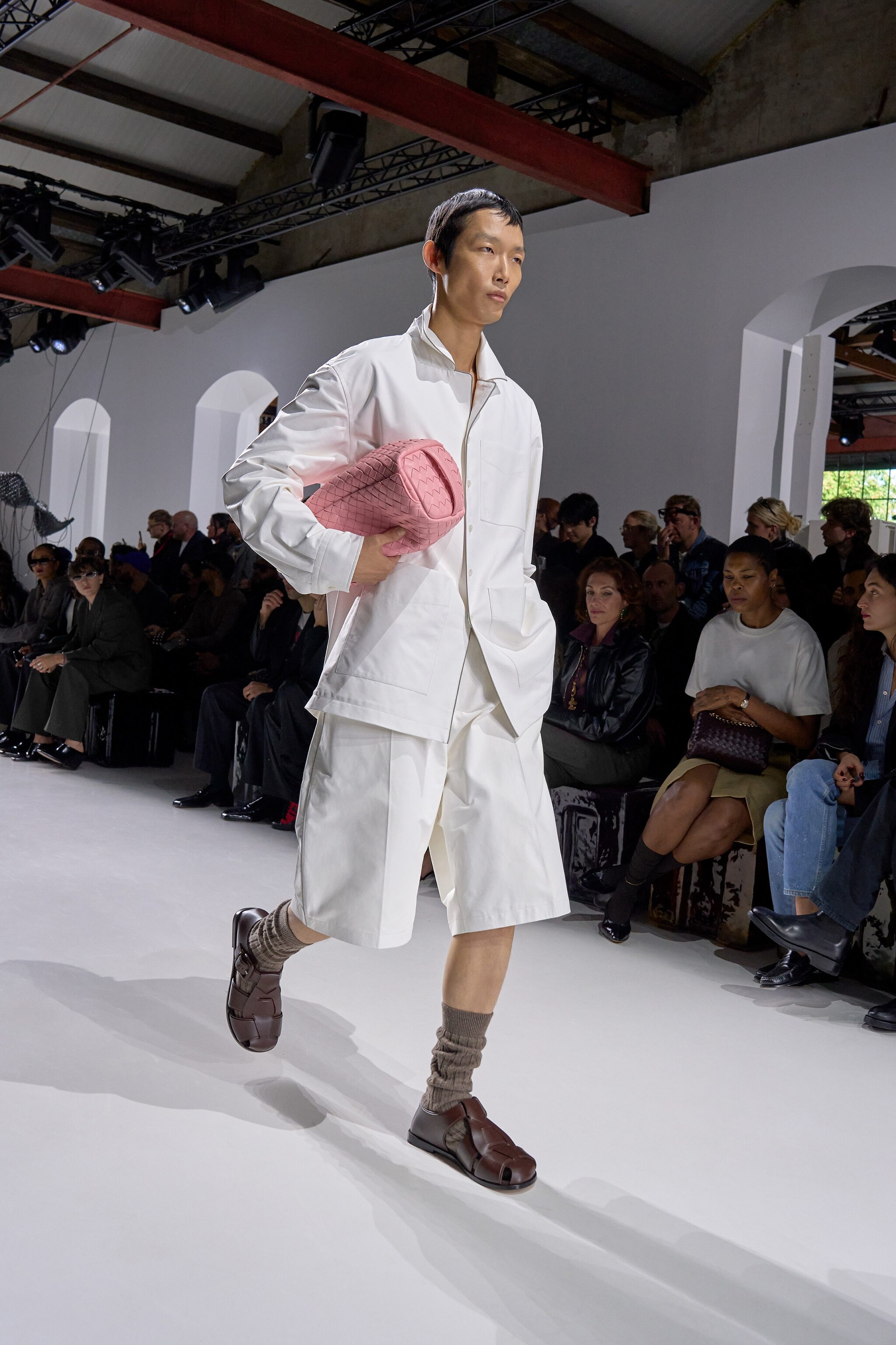 Sfila alla Milano Fashion Week la prima collezione disegnata da Louise Trotter per Bottega Veneta. Sulla passerella Primavera/Estate 2026 appaiono abiti in pelle drappeggiata e completi con l'iconico intreccio della Maison, sfilano leggiadre piume e frange che creano inaspettati volumi su giacche e bluse.