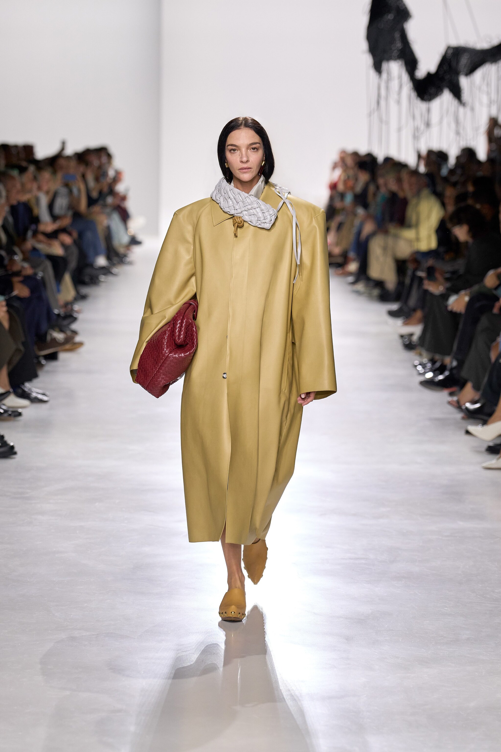 Sfila alla Milano Fashion Week la prima collezione disegnata da Louise Trotter per Bottega Veneta. Sulla passerella Primavera/Estate 2026 appaiono abiti in pelle drappeggiata e completi con l'iconico intreccio della Maison, sfilano leggiadre piume e frange che creano inaspettati volumi su giacche e bluse.