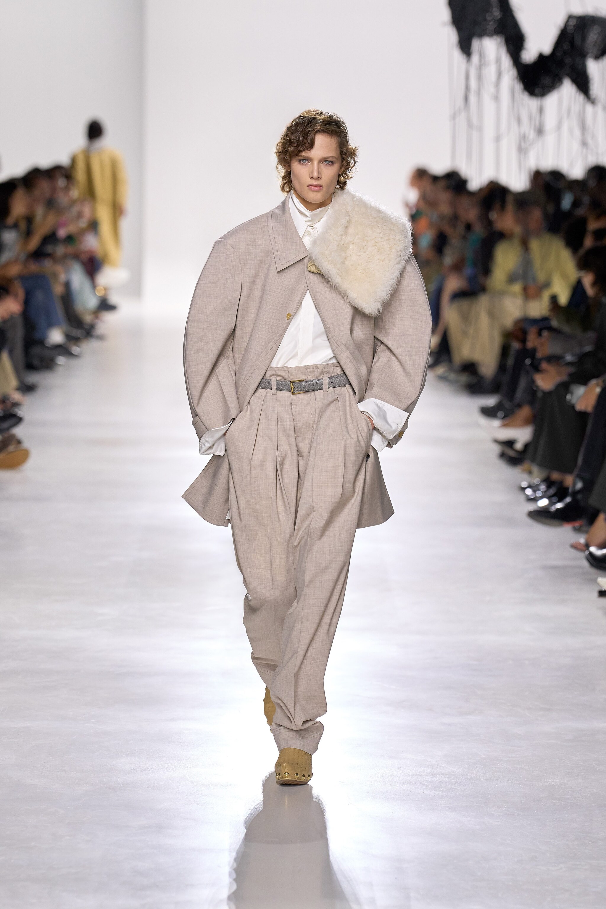 Sfila alla Milano Fashion Week la prima collezione disegnata da Louise Trotter per Bottega Veneta. Sulla passerella Primavera/Estate 2026 appaiono abiti in pelle drappeggiata e completi con l'iconico intreccio della Maison, sfilano leggiadre piume e frange che creano inaspettati volumi su giacche e bluse.