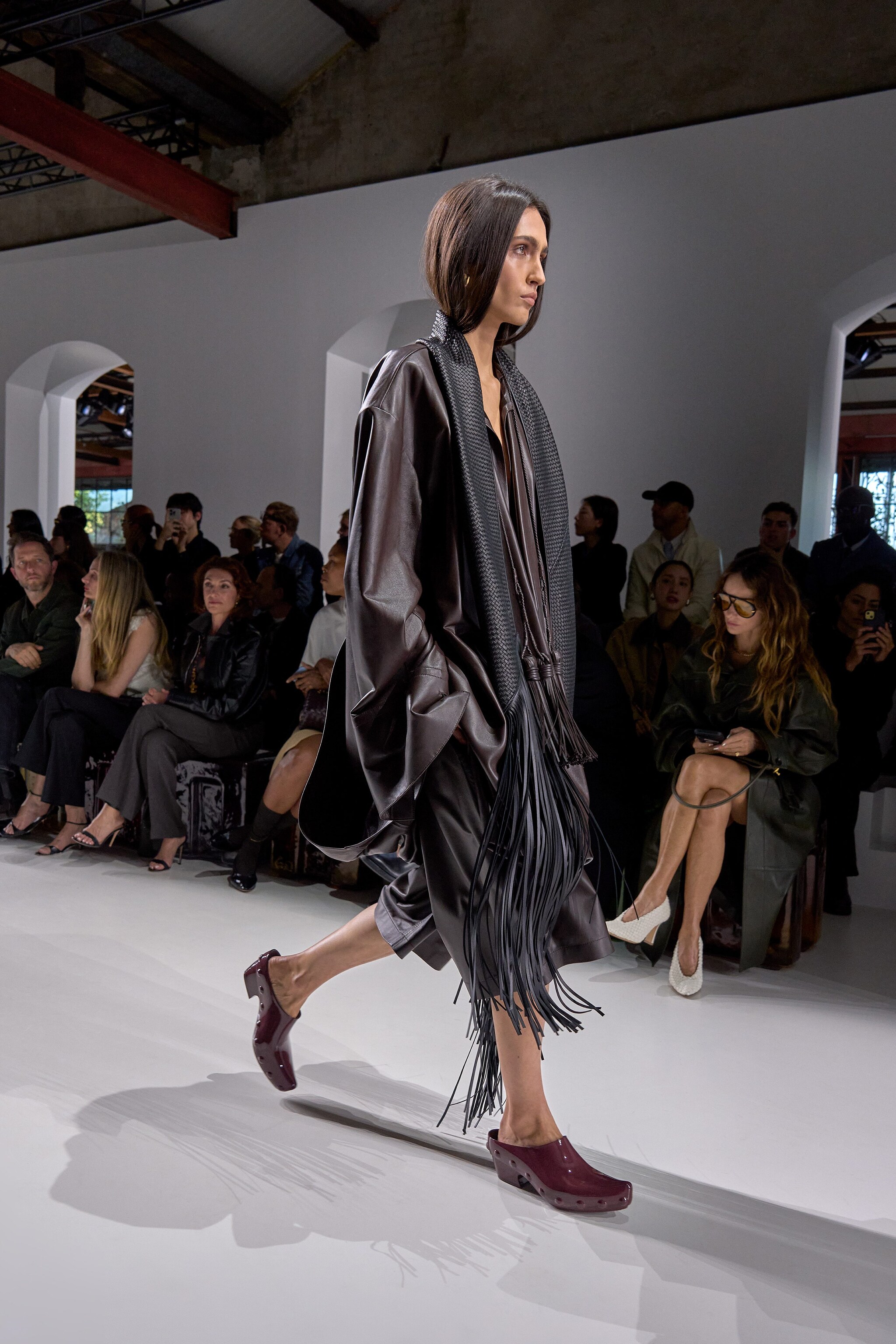 Sfila alla Milano Fashion Week la prima collezione disegnata da Louise Trotter per Bottega Veneta. Sulla passerella Primavera/Estate 2026 appaiono abiti in pelle drappeggiata e completi con l'iconico intreccio della Maison, sfilano leggiadre piume e frange che creano inaspettati volumi su giacche e bluse.