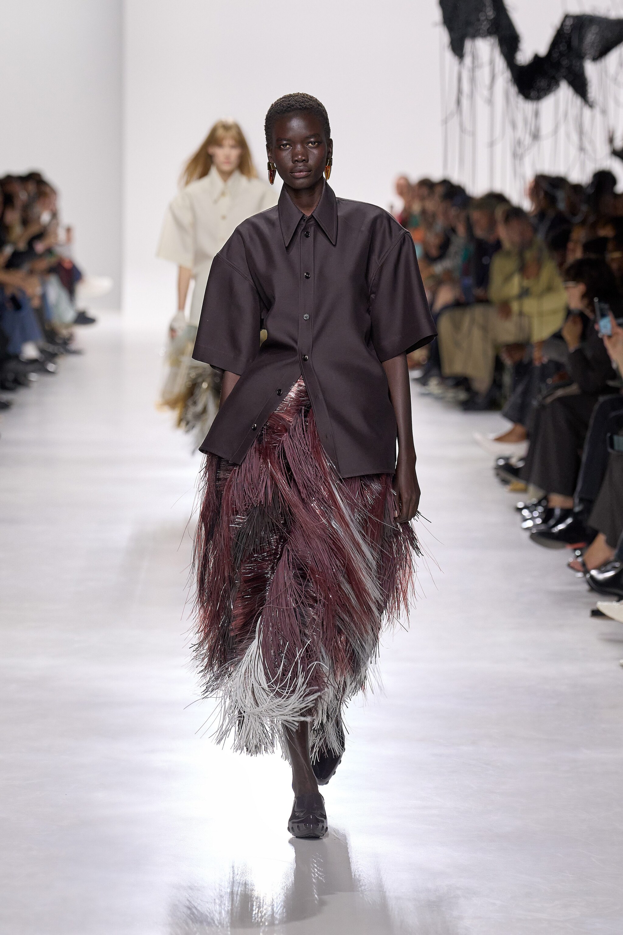 Sfila alla Milano Fashion Week la prima collezione disegnata da Louise Trotter per Bottega Veneta. Sulla passerella Primavera/Estate 2026 appaiono abiti in pelle drappeggiata e completi con l'iconico intreccio della Maison, sfilano leggiadre piume e frange che creano inaspettati volumi su giacche e bluse.