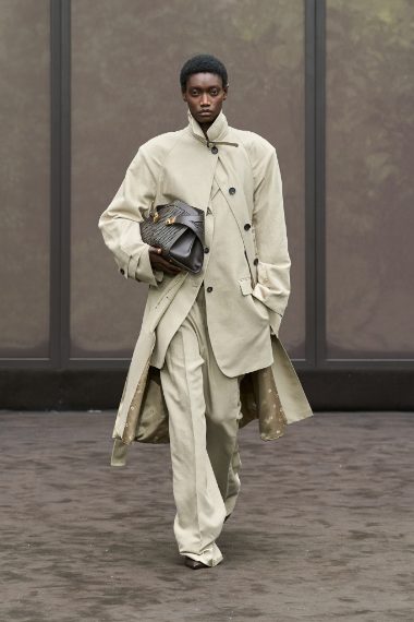 Fantasie animalier, abiti in seta dai tagli asimmetrici e con lunghe frange, trench coat e completi oversize sfilano alla Milano Fashion Week sulla passerella Primavera/Estate 2026 di Ferragamo