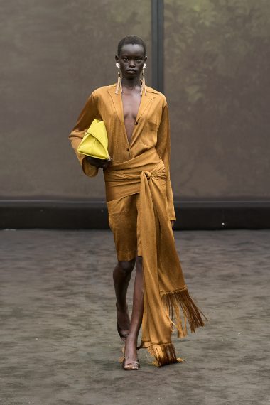 Fantasie animalier, abiti in seta dai tagli asimmetrici e con lunghe frange, trench coat e completi oversize sfilano alla Milano Fashion Week sulla passerella Primavera/Estate 2026 di Ferragamo