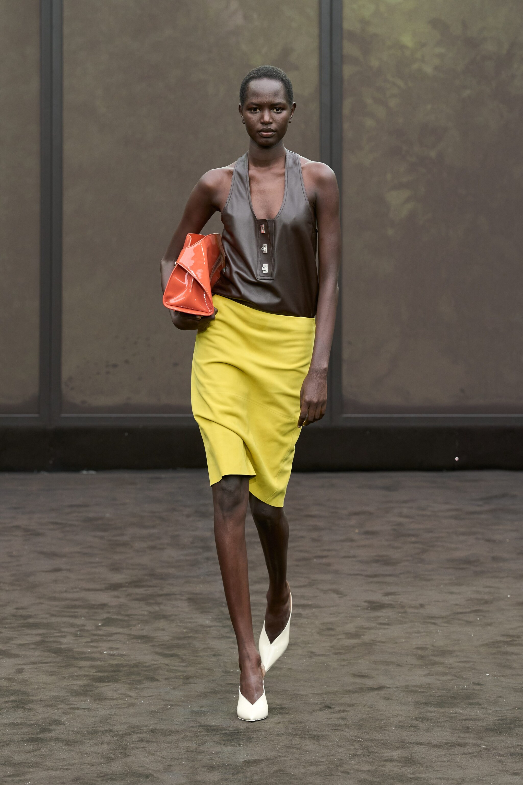 Fantasie animalier, abiti in seta dai tagli asimmetrici e con lunghe frange, trench coat e completi oversize sfilano alla Milano Fashion Week sulla passerella Primavera/Estate 2026 di Ferragamo