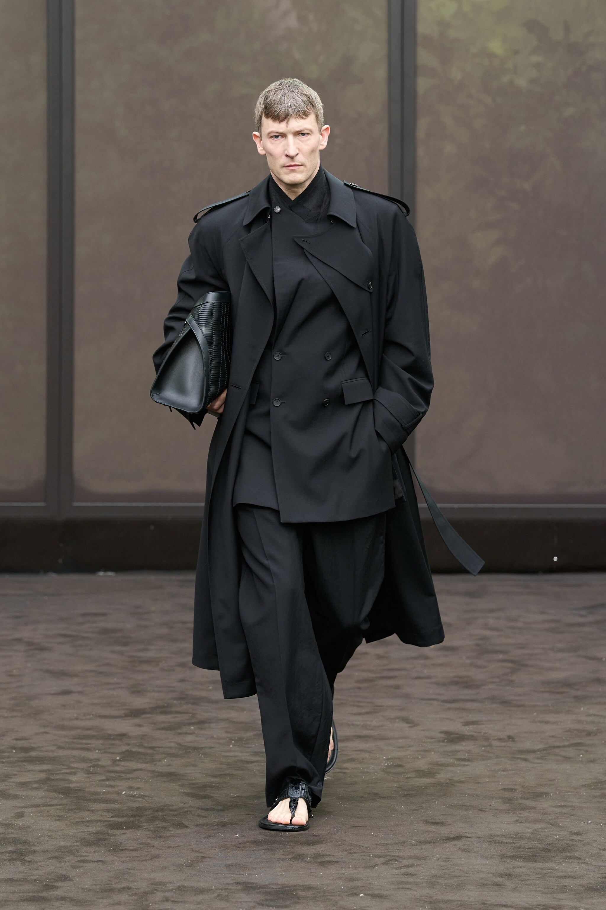 Fantasie animalier, abiti in seta dai tagli asimmetrici e con lunghe frange, trench coat e completi oversize sfilano alla Milano Fashion Week sulla passerella Primavera/Estate 2026 di Ferragamo