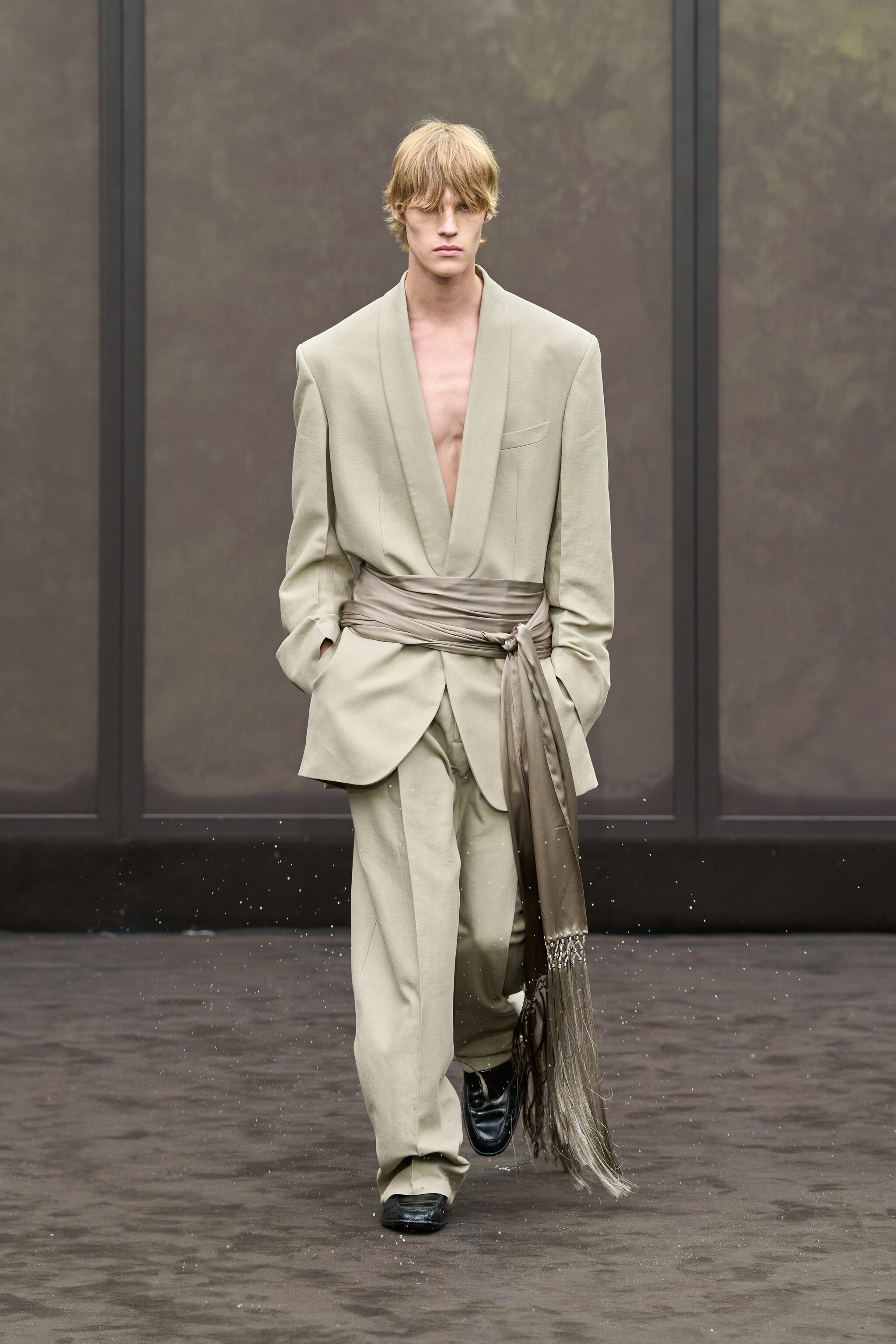 Fantasie animalier, abiti in seta dai tagli asimmetrici e con lunghe frange, trench coat e completi oversize sfilano alla Milano Fashion Week sulla passerella Primavera/Estate 2026 di Ferragamo