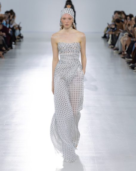 Completi e abiti con stampe a pois, dettagli in pizzo, look in seta e vaporose gonne in tulle sfilano alla Milano Fashion Week sulla passerella Primavera/Estate 2026 di Ermanno Scervino.